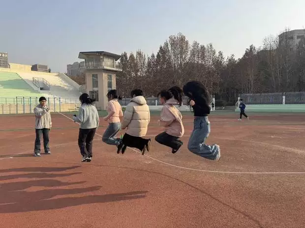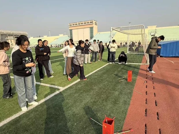 活动现场热闹非凡,四项趣味十足的赛事依次展开。“三人四足”项目中,参赛队员们两两或三人一组,用绑带固定相邻的脚,在赛道上协同前进、接力折返,步伐的默契配合彰显了团队协作的力量;“凝心跃绳”赛场,十人一组的队员们同步进入绳圈,双脚整齐跳动,在一分钟内奋力冲刺跳跃总数,每一次腾空都洋溢着青春活力;“趣味投壶”环节,同学们按抽签顺序站在1.5米线外,手持箭矢精准投掷,三次机会的角逐让现场不时响起阵阵欢呼;“彩垫扭姿”项目则充满创意与欢乐,2-4人一组的队员们听从“部位+彩点”指令在垫上摆出各种姿势,坚持到最后的队员为小组赢得积分,趣味十足的比拼让大家乐在其中。