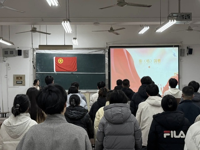 仪式以全场齐唱国歌开场,激昂的旋律里,青年们的目光都投向讲台旁的团旗,歌声里满是对组织的向往与热忱。随后,工作人员庄重宣读30名新团员名单,每念完一个名字,现场便响起一阵掌声,是对新团员成长与选择的真挚祝贺。紧接着的佩戴团徽仪式,让现场氛围愈发热烈。学院团委副书记邓豪手持崭新的团徽,依次走到每一位新团员面前,将闪耀的团徽郑重别在他们的胸前。当金色的团徽贴上衣襟的那一刻,不少新团员的眼中泛起光亮 —— 这枚小小的徽章,是身份的象征,更是责任的印记。有同学轻轻抚摸着团徽,嘴角的笑意里藏着掩不住的激动。佩戴团徽后,新团员们整齐列队,面向团旗肃立。在领誓人殷姿涵的带领下,他们举起右拳,字字铿锵地念出入团誓词:“我志愿加入中国共产主义青年团…… 为共产主义事业而奋斗!” 誓词声在教室内回荡,每一个字都浸着青年的坚定,将仪式的庄重感推向顶峰。宣誓结束后,新团员代表胡杨走上讲台。她指尖轻触胸前的团徽,分享道:“从递交申请书到今天戴上团徽,这枚小小的徽章,是我成长里最珍贵的标记。未来我会带着这份责任,在学业里勤耕,在集体中奉献。” 随后,团委副书记邓豪寄语新团员,鼓励大家以团徽为 “青春坐标”,在日常中践行团员义务,让青年的朝气与担当,在学习、实践的每一处细节里发光。