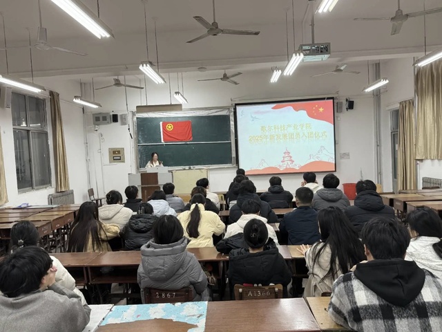 冬日的 6207 教室暖意交织着庄重,12 月 9 日下午五点,歌尔科技产业学院 2025 年新团员入团仪式在此正式启幕。本次仪式聚焦 “吸纳青年力量、践行青春使命”,30名通过团组织考察的青年学生、学院团委副书记邓豪及工作人员齐聚现场,教室内悬挂的团旗鲜红醒目,投影屏上 “新团员入团仪式” 的主题画面与暖黄灯光相衬,将氛围烘托得既热烈又肃穆。