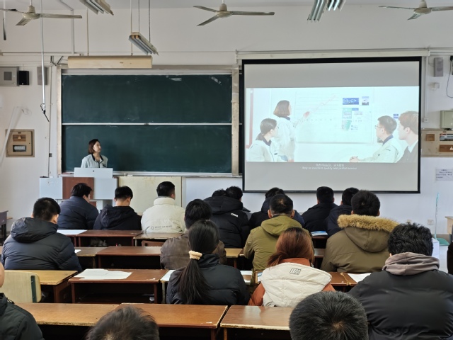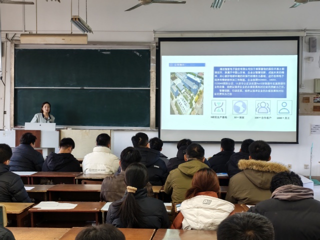 宣讲会上,企业宣讲人以图文结合的形式展开分享,通过PPT课件详细介绍了潍坊智新电子的发展历程:公司坐落于潍坊,隶属于中国山东,深耕电子元件和精密部件加工制造领域,拥有5大生产基地、业务覆盖10余个国家、合作客户超300家、员工规模达1000余人,还先后通过ISO9001质量管理体系、ISO14001环境管理体系等多项认证。宣讲人还结合生产车间实景视频、企业服务场景展示,生动讲解了公司的核心业务、岗位需求、人才培养体系以及职业发展空间,让学生直观了解企业的发展实力与用人标准。台下参会学生全神贯注,一边聆听企业介绍,一边对照自身专业与职业规划做记录,不少学生还就岗位任职要求、薪资待遇、晋升通道等问题与宣讲人展开互动交流,现场问答环节气氛活跃。