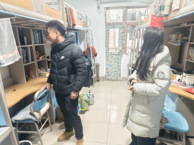 检查活动分为学生自查-辅导员通查-学院抽查方式进行,学院全体辅导员带领检查小组,逐层、逐户对学生公寓进行了细致走访。他们重点排查了宿舍内是否存在违规电器、私拉乱接电线、存放易燃易爆物品等消防安全隐患,同时仔细检查了用电安全、设施完好程度、卫生状况以及公共区域的安全通道是否畅通。每到一间宿舍,辅导员老师都认真查看、详细询问,并与同学们进行亲切交流,了解他们的日常生活和学习情况,叮嘱大家要牢固树立安全意识,自觉遵守学校公寓管理规定,养成安全用电、节约用电的良好习惯,共同维护宿舍安全与整洁。在学院抽查时张付功强调,学生公寓是同学们学习、生活的重要场所,安全工作是重中之重,必须常抓不懈。他要求全体同学要充分认识到安全的重要性,从自身做起,从小事做起,坚决消除各类安全隐患。