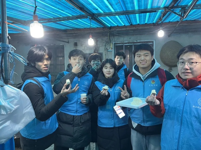 在西黑冢子后村,走进村民的温室,志愿者们被眼前的景象震撼:番茄、彩椒、黄瓜等蔬菜分层次划区域生长,各种各样的设施把大棚内的温度、湿度、养分调控的恰到好处,在这里,耕种不再是传统的“看天吃饭”。在当地农业技术员金文波的带领下,实践团先进入一段“隧道”才进入种植区,经过介绍志愿者们知道了这在专业上叫做“缓冲隧道”或“保湿隧道”,和厚土墙、半地下结构配套,一般是砖砌或土墙围起来的,这样能起到有效的保温作用,它连接着白雪皑皑和春意盎然,隧道的缓冲加上冬式大棚自带的采光、保温、抗风的优点以及后墙的保温作用三者相辅相成。同时“向阳花”志愿服务者们还开展了“科技小院”助农活动,为菜农讲解无人机植保、电商直播等新技能。来自志愿服务队的李同学表示:“寿光的经验告诉我们,乡村振兴离不开科技创新和人才支撑。大棚内,水肥一体化系统自动调配养分,队员们观察到气雾栽培、立体种植等新型模式,相较于传统种植,不仅产量提升20%以上,还实现了节水50%、节肥30%的生态效益,让大家真切感受到科技为农业发展带来的质的改变。在参观完蔬菜大棚后,志愿者们来到了 西黑冢子村的豆腐坊,近年来,西黑冢子村依托传统豆腐制作技艺,大力发展“豆腐经济”。志愿者们了解到了豆腐坊的发展史,在村党支部书记孙俊山带领下,村里成立了豆腐专业合作社,统一采购原料、制定标准、打造品牌。“传统技艺是乡村文化的根,我们要用年轻人的视角和方式,让更多人了解、喜欢这些老手艺。”来自歌尔科技产业学院向阳花志愿服务队的刘同学表示,她和队友们计划为西黑塚子村设计一套豆腐文创产品,包括豆制品食谱、豆腐文化明信片等,助力乡村文化传播。