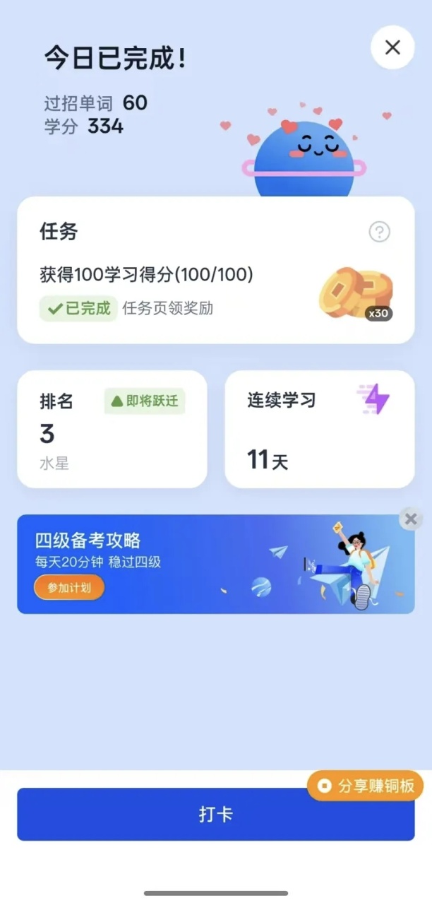 活动紧扣四级备考核心需求,引导同学们每日完成单词背诵、听力训练、真题练习、作文仿写等学习任务,并在微信群内上传学习截图打卡。学习部成员每日做好统计与提醒,及时分享备考技巧、高频词汇、答题思路等干货资料,让线上群成为“移动自习室”与“互助加油站”。全院同学积极参与、坚持打卡,在群内相互鼓励、比学赶超,学习氛围浓厚有序。此次四级打卡活动,将日常学习与学风建设紧密结合,把“要我学”转变为“我要学”,把零散学习变为系统坚持。同学们在每日打卡中养成自律习惯、补齐英语短板、提升应试能力,以实际行动践行优良学风。活动不仅为四级考试筑牢基础,更让勤学、笃行、自律、共进的学风理念深入人心,充分展现歌尔科技产业学院学子积极向上、奋勇争先的精神风貌。